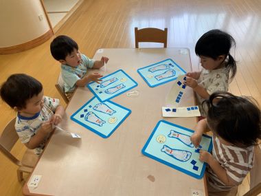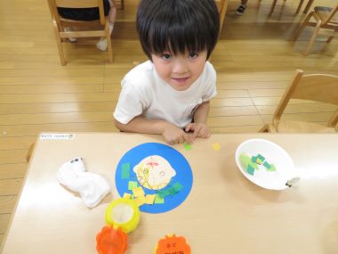 年少さんはクレヨンで描いたお父さんの顔の周りに画用紙を切ったものをのりで貼っています。これはうちわになるんですって。これからの暑い時期、お父さんをあおいであげてもいいですね。