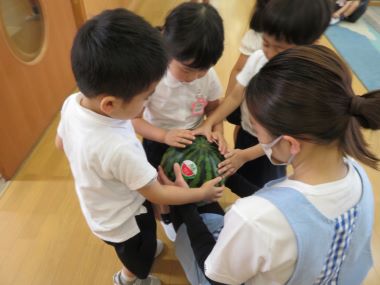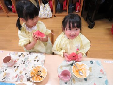 給食でののさまにお供えしたスイカをいただきました。年少さんも種を上手に出しながら食べています。
