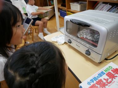 年長さんはトースターをワクワクしながら覗いています。プラバンのキーホルダーを作っています。プラバンはトースターに入れると、動きながら4分の1に縮みます。その様子を見ていたんですね。