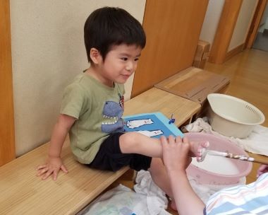 2歳のお友だちは足形を取っています。足の裏に絵の具を塗るとくすぐったいな。かわいらしい足形はシロクマになったようです。ビニールテープの氷を貼って完成です。