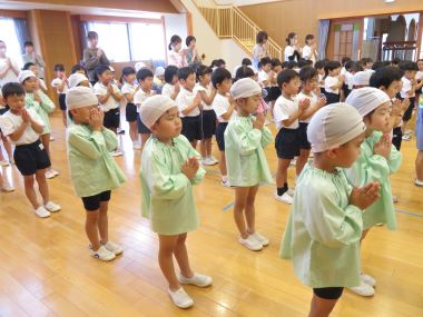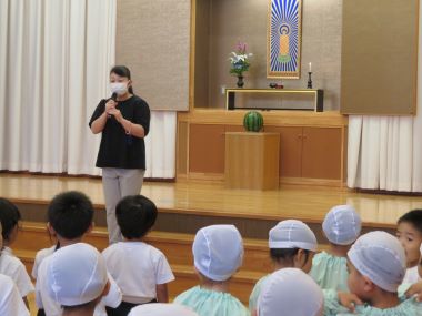 3歳以上児のお友だちは遊戯室で集会をします。のの様にスイカをお供えし、お約束を守り安全に楽しく水遊びをすることをお誓いしました。