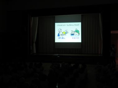 プールを準備してくれる先生やプール道具を準備したり洗濯してくれるお家の方など、皆さんのおかげでプール遊びができる事を園長先生が集会でお話下さいました。