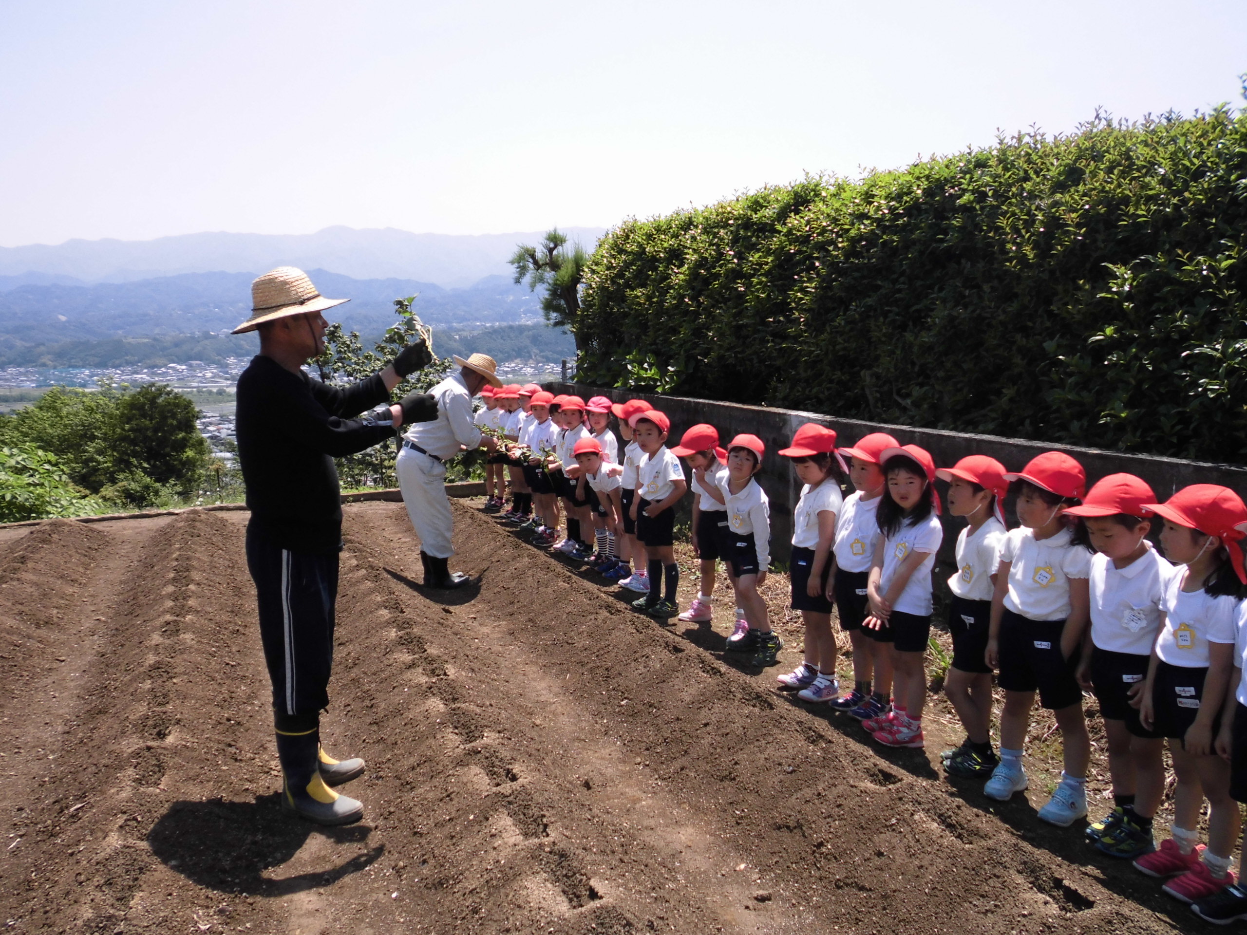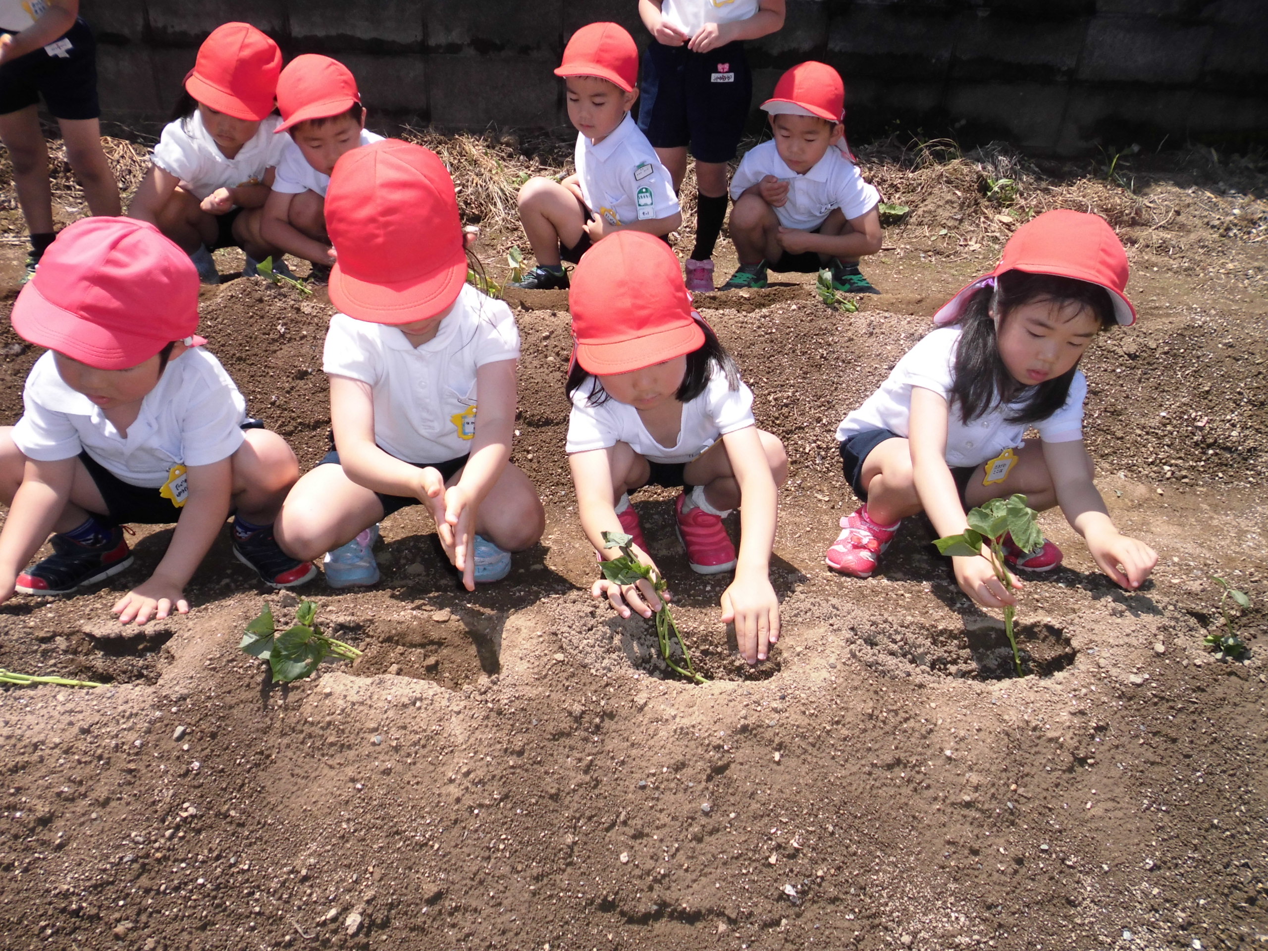 5月20日(水)、芋畑に苗を植えに行ってきました。初めに「お芋の先生」斎藤先生から、植え方を教えてもらい、慣れない手つきで一生懸命植えました。苗は全部で350本、みんな頑張りました。