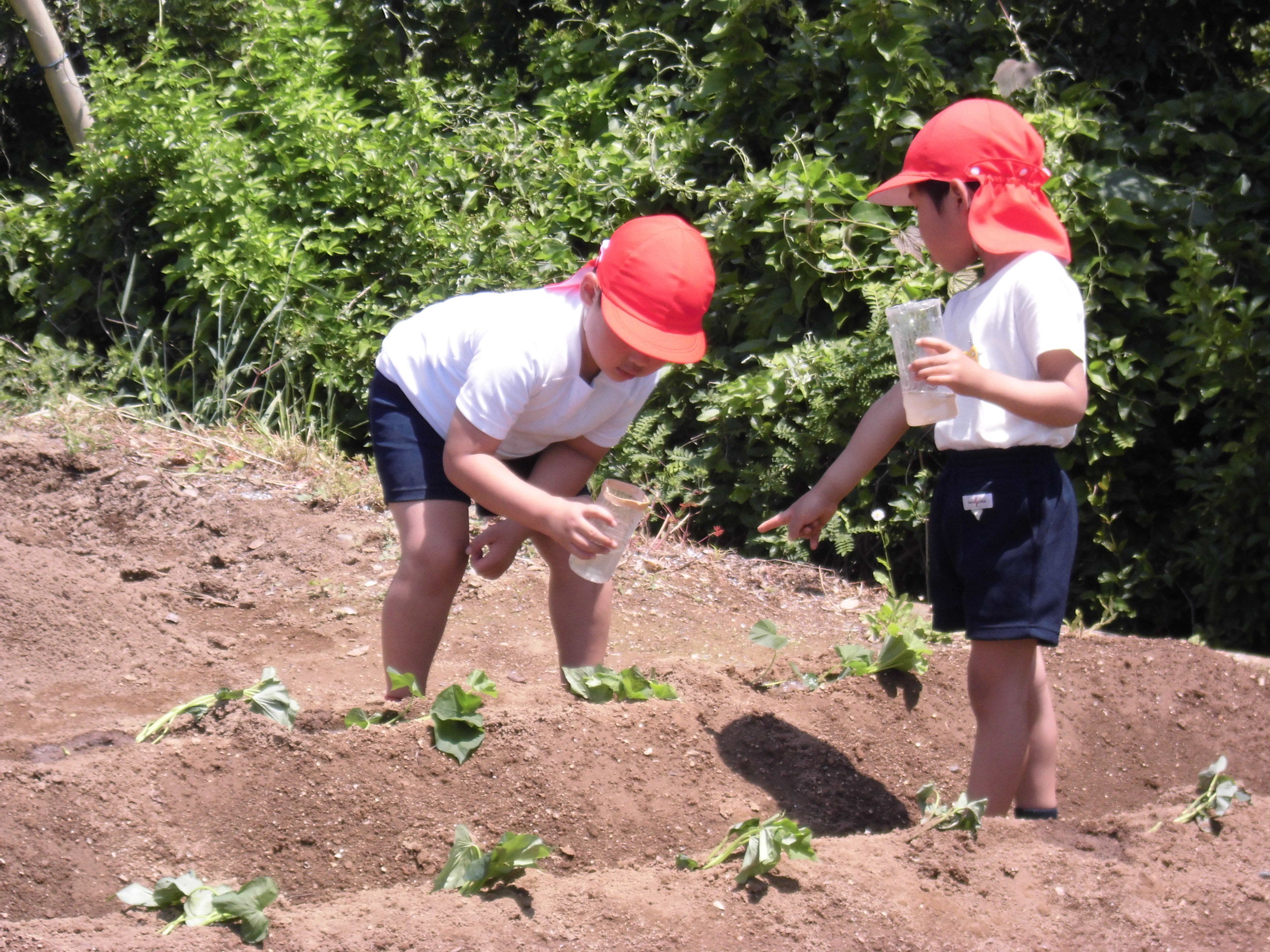 植えた後はお水をたっぷりあげます。一人ひとりが手にしたものはペットボトルですが、何度も汲みに走っては水を流していました。「そこ、足りないんじゃない?」「うん、たっぷりやるか!」早く良い根がつくと良いですね。