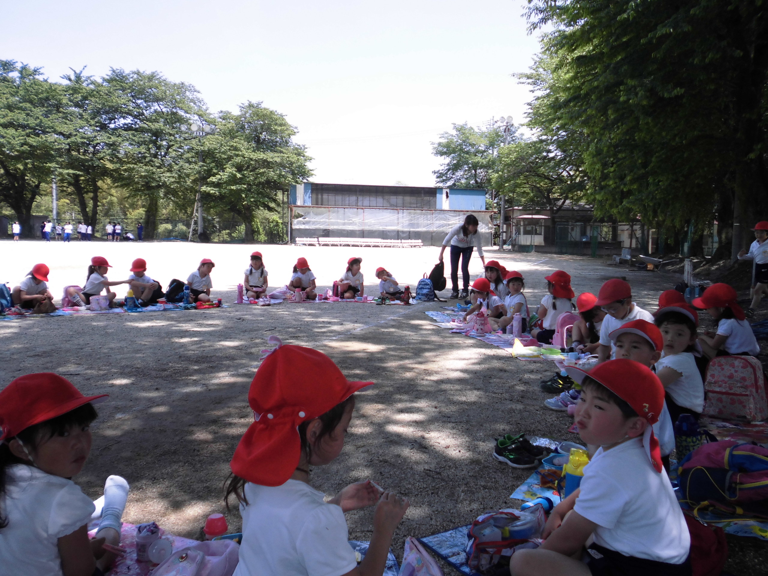 作業が済んだら、お待ちかねのお弁当。飯田女子高校のグランドをお借りして、木陰でいただきました。「おかあさんお弁当ありがとう。」