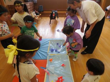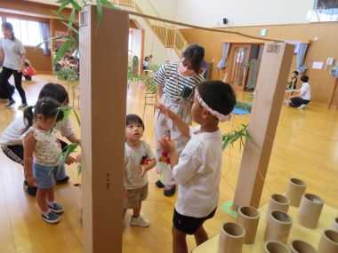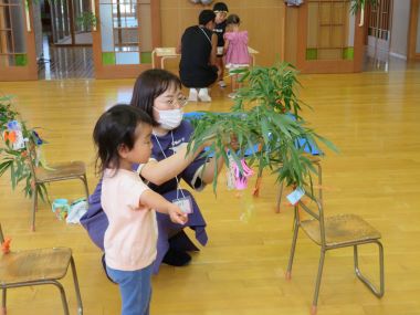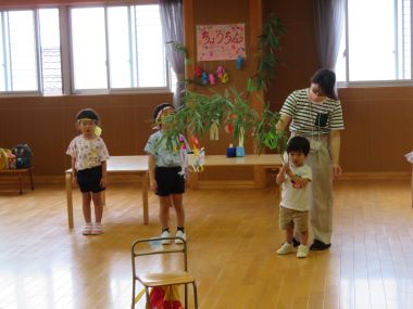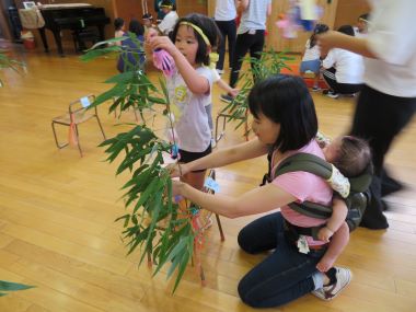 8月1日のさくらんぼは、月遅れの七夕。年長のお兄さん、お姉さんと「たなばたなつまつり」を楽しみました。