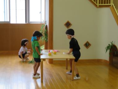 さくらんぼさんが帰ってからは、楽しかった余韻を感じながら年長さんが皆で遊戯室を片付けてくれました。「楽しかったね。また一緒に遊びたいな」