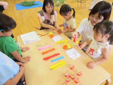 さあ、たなばたなつまつりが始まります! 年長さんはハチマキをしてそれぞれのコーナーに分かれて七夕の飾りを一緒に作ったり遊んだりしてくれます。