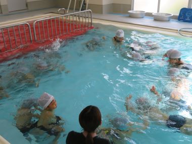 年中さんは、1.2の3で水に入ってみました。水に顔を付けたりもぐったりと「やってみよう!」とそれぞれに頑張る姿がありました。