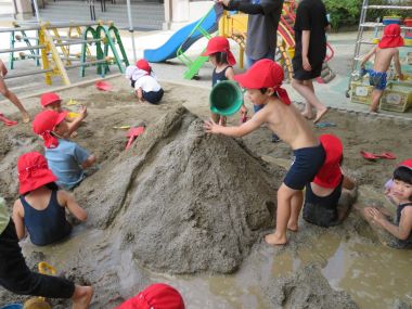 プールから出た年中さんは、そのまま庭に出て泥んこ遊びをしました。砂や水の感触を味わいながらダイナミックに遊んでいます。