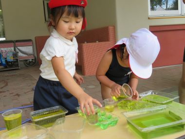 年少さんは、色水遊び。きれいな透明の色水をすくって混ぜていました。色の変化に驚いたり、思った通りの色になって満足したりと、様々な発見があったようです。