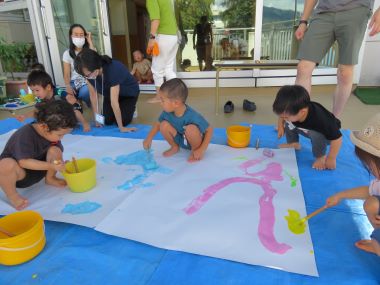 ベランダに広げたブルーシートの上に大きな紙。様々な色の絵の具と、ローラーや太筆、子どもたちはすぐに夢中になってくれました。