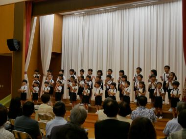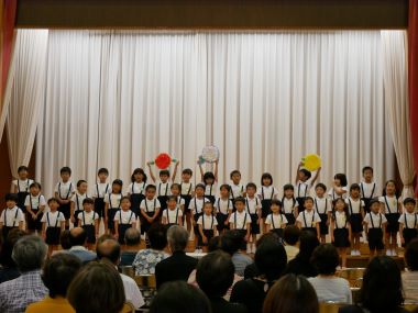 年長児の歌、「きくのはな」「楽しいね」「しあわせならてをたたこう」をお聞き頂いた後に、会場の皆さんも一緒に「ゆうやけこやけ」を歌いました。