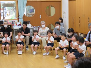 年少さんは普段園で歌っている歌を聞いて頂いたり、朝のお参りの様子を見て頂きました。その後は「あくしゅでこんにちは」「げんこつ山のたぬきさん」などの触れ合い遊びを楽しみました。