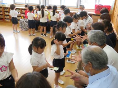 祖父母の方々と「仲良しジャンケン」や「銀行ジャンケン」をして楽しみました。ジャンケンで勝つとお金がもらえます。お友だちのおじいさんおばあさんとも楽しむことができました。