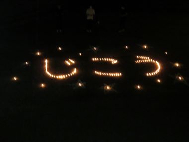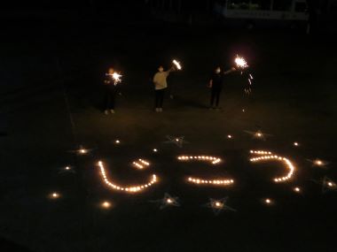 先生たちが準備していたのは、これなんです。ちいさなろうそくの灯が集まって「じこう」の文字になっています。こども達は2階のテラスから「きれーい」と見入っています。