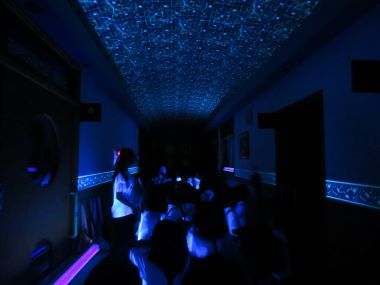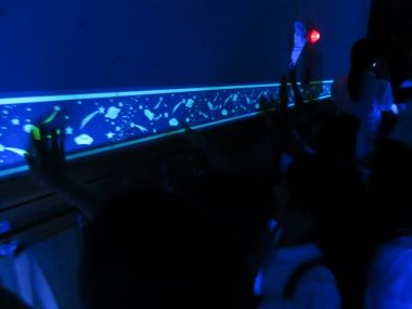 ブラックライトに反応し、天井に星空が浮かび上がりました。「わー、きれい!!」「こっちも光ってるよ!」どうして光るのかな?と思わず触っています。
