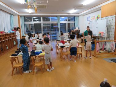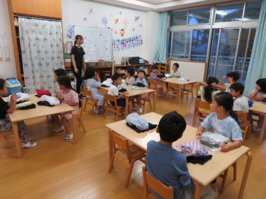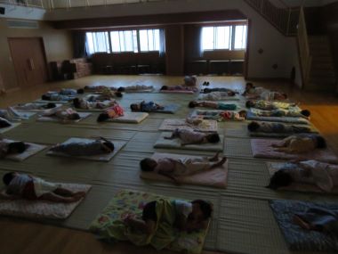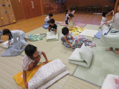 皆で「おはようございます」自分で布団を袋にしまいます。ビックリするほど寝起きがよく、自分で布団をしまえました。