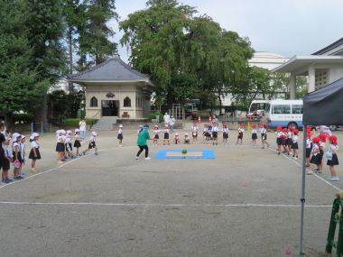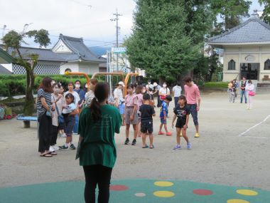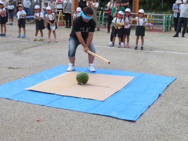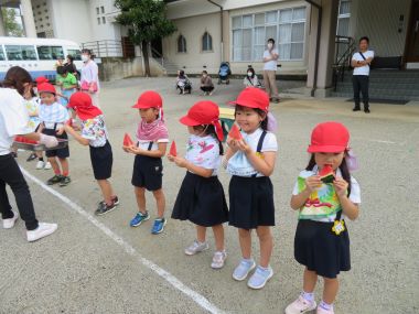 こども達もお迎えにみえた保護者の方も一緒にスイカをいただきます。秋の始めのスイカ、今年の食べ納めですね。