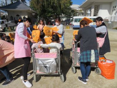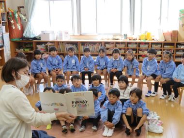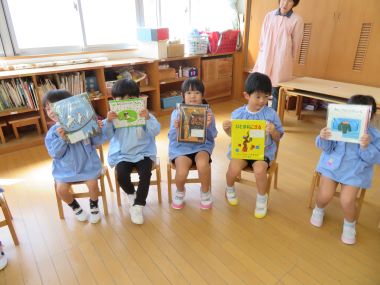 図書館の司書の先生が絵本を持って園に来て下さいました。各クラスで読み聞かせをしてでいただいてから、一人一人にプレゼントして下さいました。