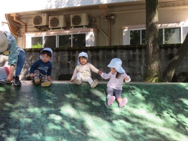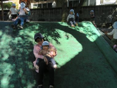 お友だちと滑ったり先生と一緒に滑ったりしながら秋を感じて遊ぶこどもたちです。