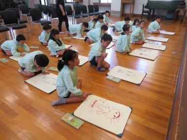 年長さんが本堂で阿弥陀様の絵を描いています。心を落ち着けて「自分の ののさま」を描きます。