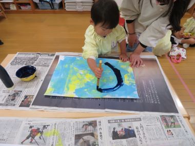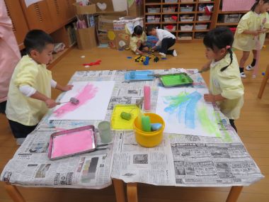 年少さんは大きな紙に絵の具でローラーをかけています。大きく手を動かしながら好きなようにローラーを動かしていました。