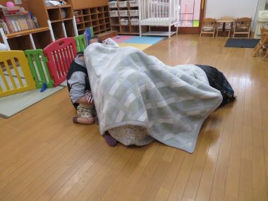 庭で遊んでいた年少さんは園庭の真ん中に急いで集まりました。つくしさんも皆で集まって、頭を保護する毛布をかぶって揺れが収まるのを待ちます。