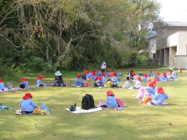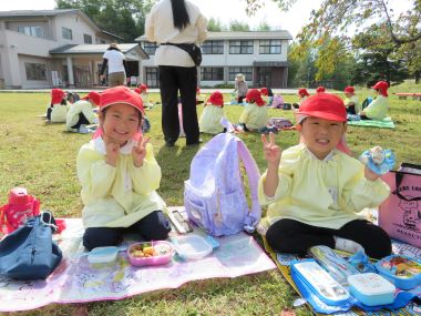 お待ちかねのお弁当です。沢山歩いて遊んだ後のお弁当は格別ですね。お家の方には、朝からお弁当の準備、ありがとうございました。