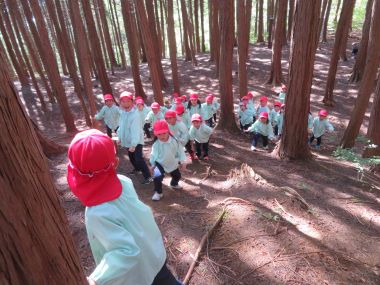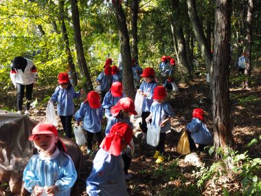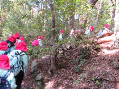 年長さんは、グランド脇の山道を通って狐塚古墳に行きました。古墳の急な斜面を使って「だるまさんがころんだ」をしたり、木の実を拾ったりして楽しみました。