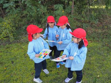 年中さんは、16色の折り紙を貼った色探しカードをみながら、見つけたものがどんな色かカードと見比べたりしています。