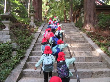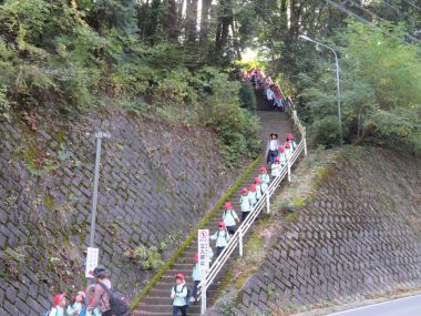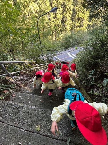 年長さんは階段や急な山道を木の実を拾いながら歩いて短大に向かいます。