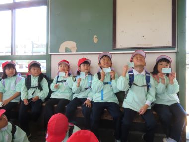 伊那八幡駅で年長さんに切符を渡しました。飯田駅までしっかり持っていってもらいます。