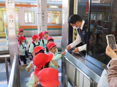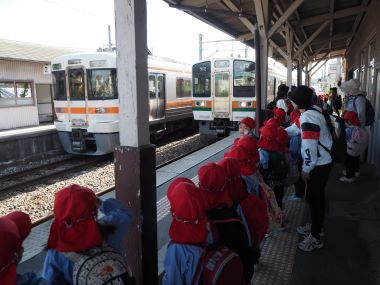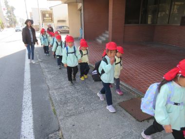 駅までは、年長さんが年少さんと手をつないで歩きます。道路から遠い歩道を安全に歩いて連れて行ってくれました。