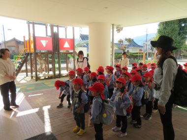 3歳以上のお友だちは園庭に集まって園長先生のお話をお聞きして出発です。