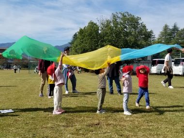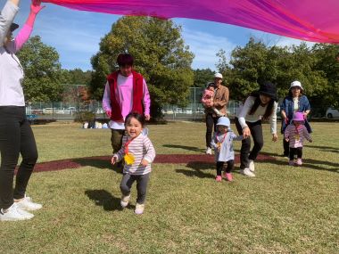 かけっこをしたり、きれいな色のビニールトンネルを通ったりしています。普段の園での様子を垣間見て頂けたようです。