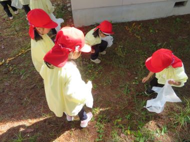 短大に着きました!思わず走る年長さん。袋の中には拾った木の実が沢山入っています。