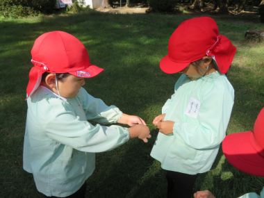 年長さんは八幡神社の広場でオオバコ相撲をしています。どの茎が強そうかな?と選んで何度も友だちと対戦していました。
