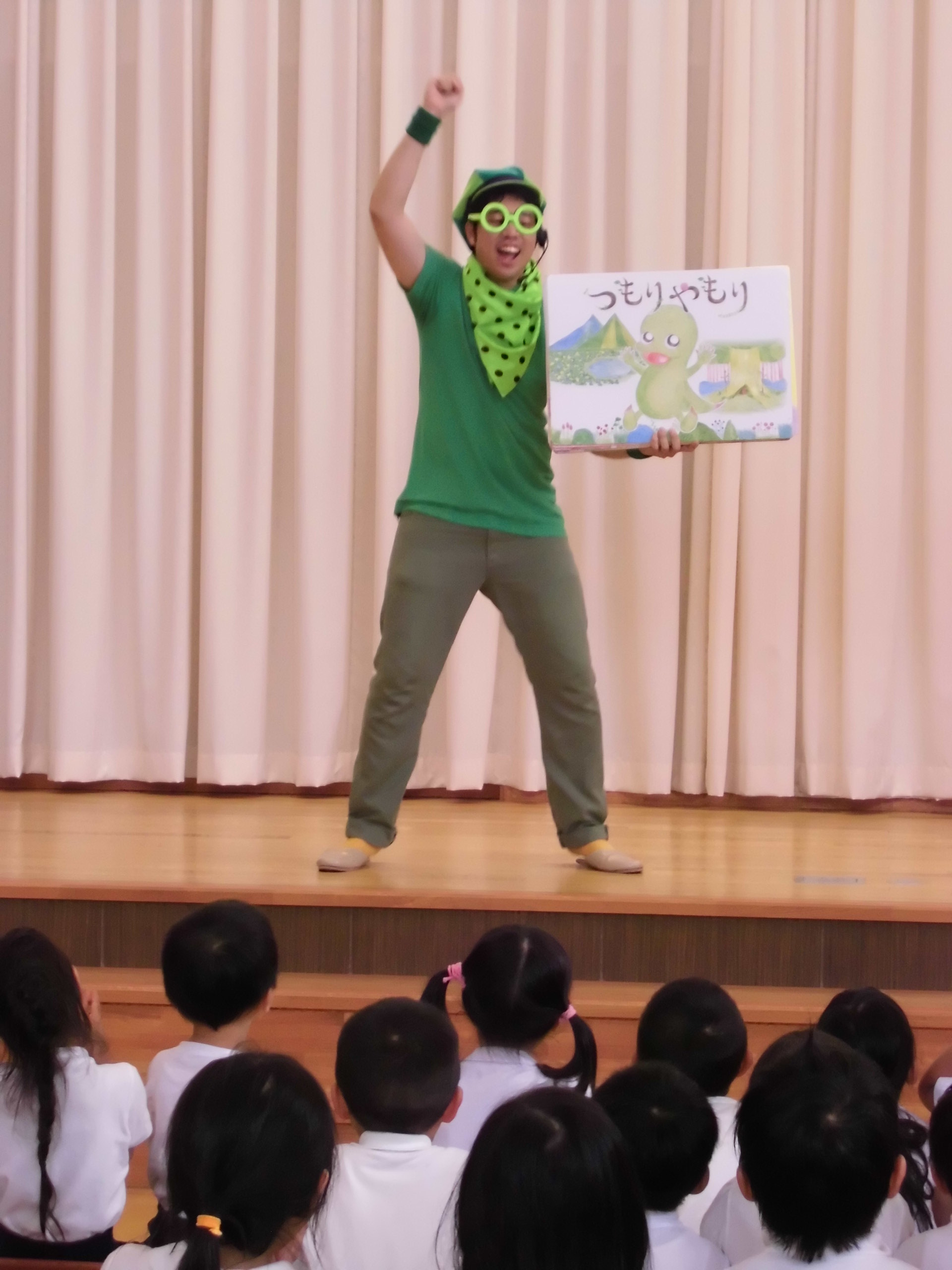 6月22日(月)午後、慈光幼稚園に『つもりやもり』のパピ君が、お話のお兄さんと一緒にやってきました。小さな子どもたちは午睡をする時間だったので、代表して年長さんが参加しました。