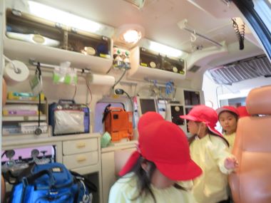 車両を見せて頂きました。「救急車の中にベットや色んな機械があるんだね」