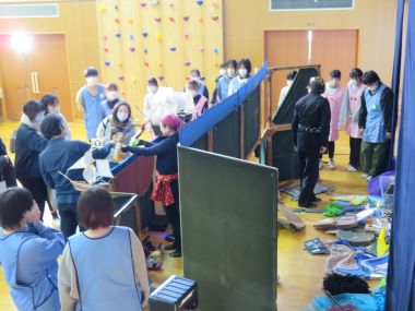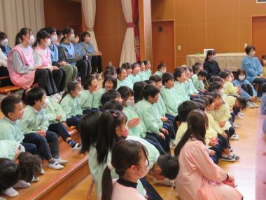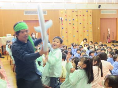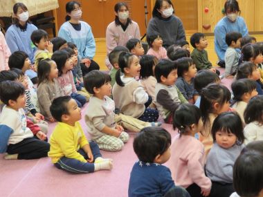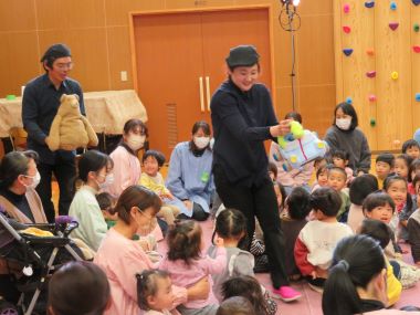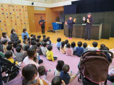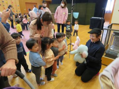 はじめはじーっと見ているだけでしたが、ひとりのお友だちが声を出して笑い出すと、笑っていい・・・ということが分かったようで、大勢のお友だちの笑い声が会場に広がり、お友だちと一緒に楽しんで見られました。