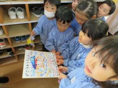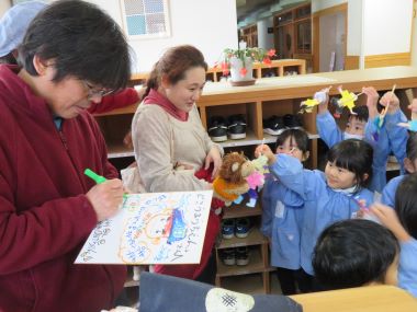 お帰りの際に園へ色紙を描いて下さいました。うめ組のお友だちは、自分の人形を持ってきて見ていただいたり、劇団の方の人形とのやり取りを楽しみました。