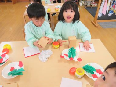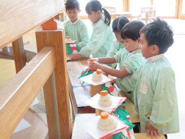 おもちつきの前日、年長さんが作っているものは、かがみもちを飾る台やうらじろなどです。それぞれの由来をお家の方や先生に聞いて作っていました。