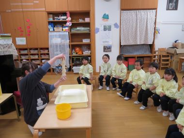 年少さんと年中さんには先生がクラスのかがみもちを作っています。おもちがのびる様子を見て「おーっ」と歓声があがりました。