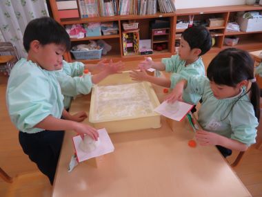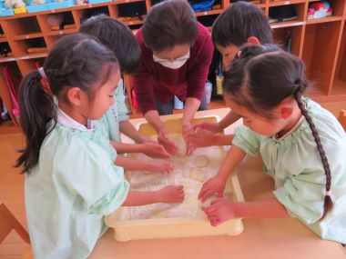 「おもちはプニプニしていたよ。2つ上手に丸くできた」と年長さん。