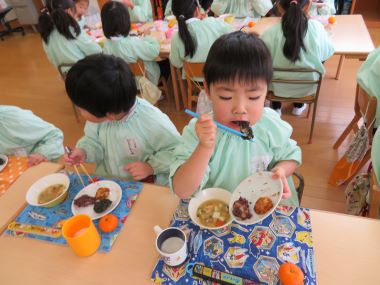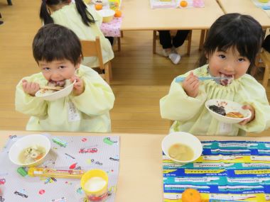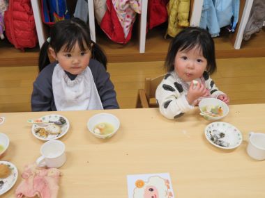 0,1歳児のお友だちは、ごはんにあんこやきなこ、ごま、ふりかけを付けたコロコロおにぎり、2歳のお友だちは、おはぎとおもちも頂きました。
