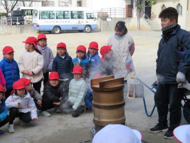 朝から火を焚いて用務員の先生がもち米をふかす準備をして下さっていると、年長さんも様子を見に来ました。