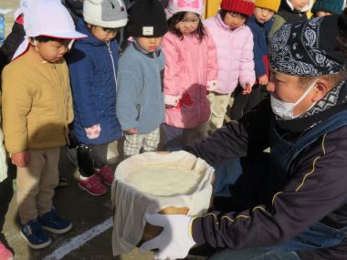 雪の舞う寒い朝でしたが、おもちつきが始まる頃には日差しが出てきて、園庭で行うことができました。