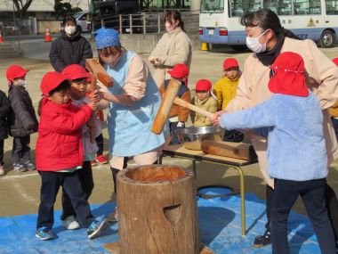 今はなかなか、もち米をふかして臼と杵を使っておもちをつくご家庭は少なくなりましたが、こどもたちは年末のおもちつきを体験できました。