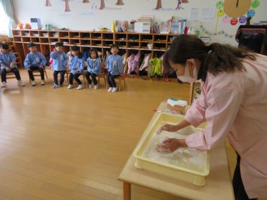 年長さんのお部屋を見に来たすみれさんに和子先生がおもちを見せてくれました。